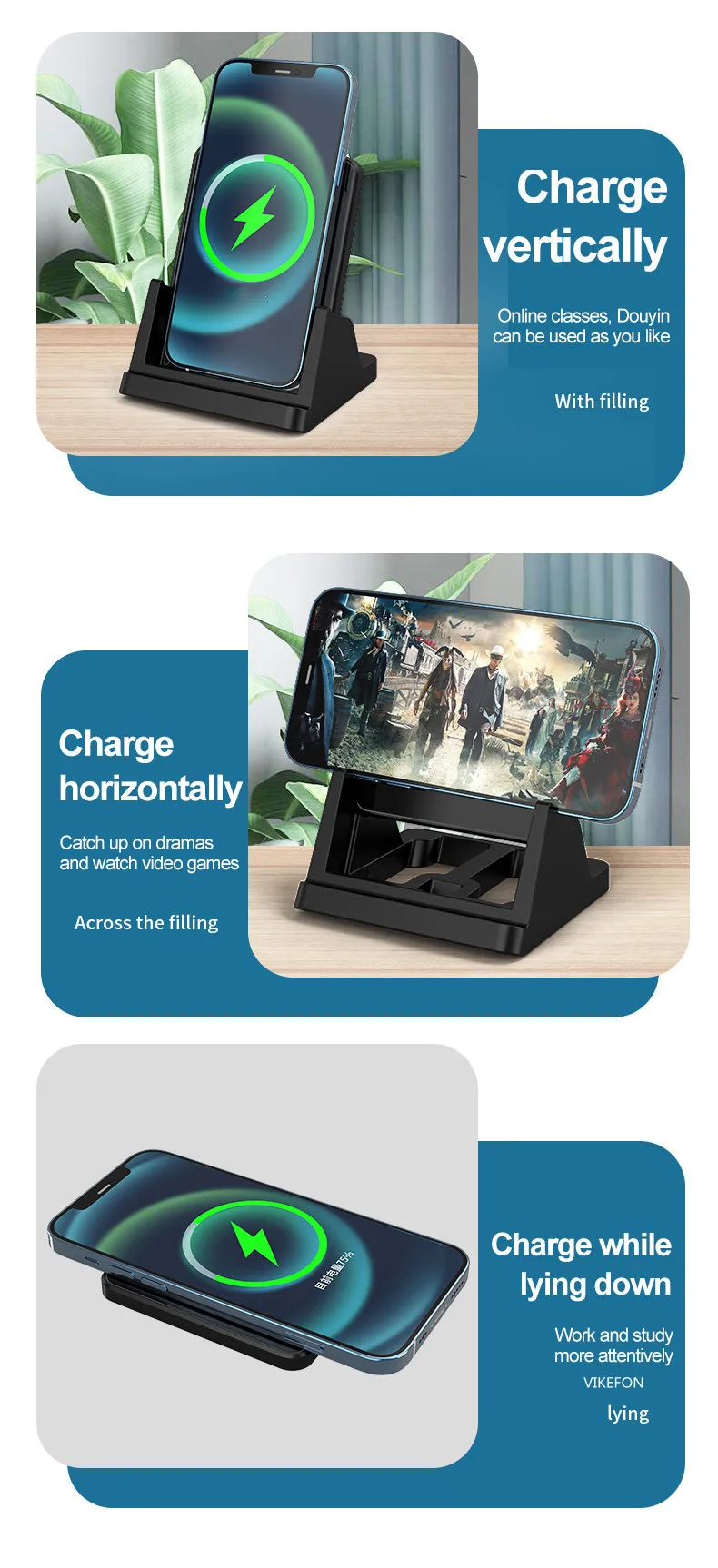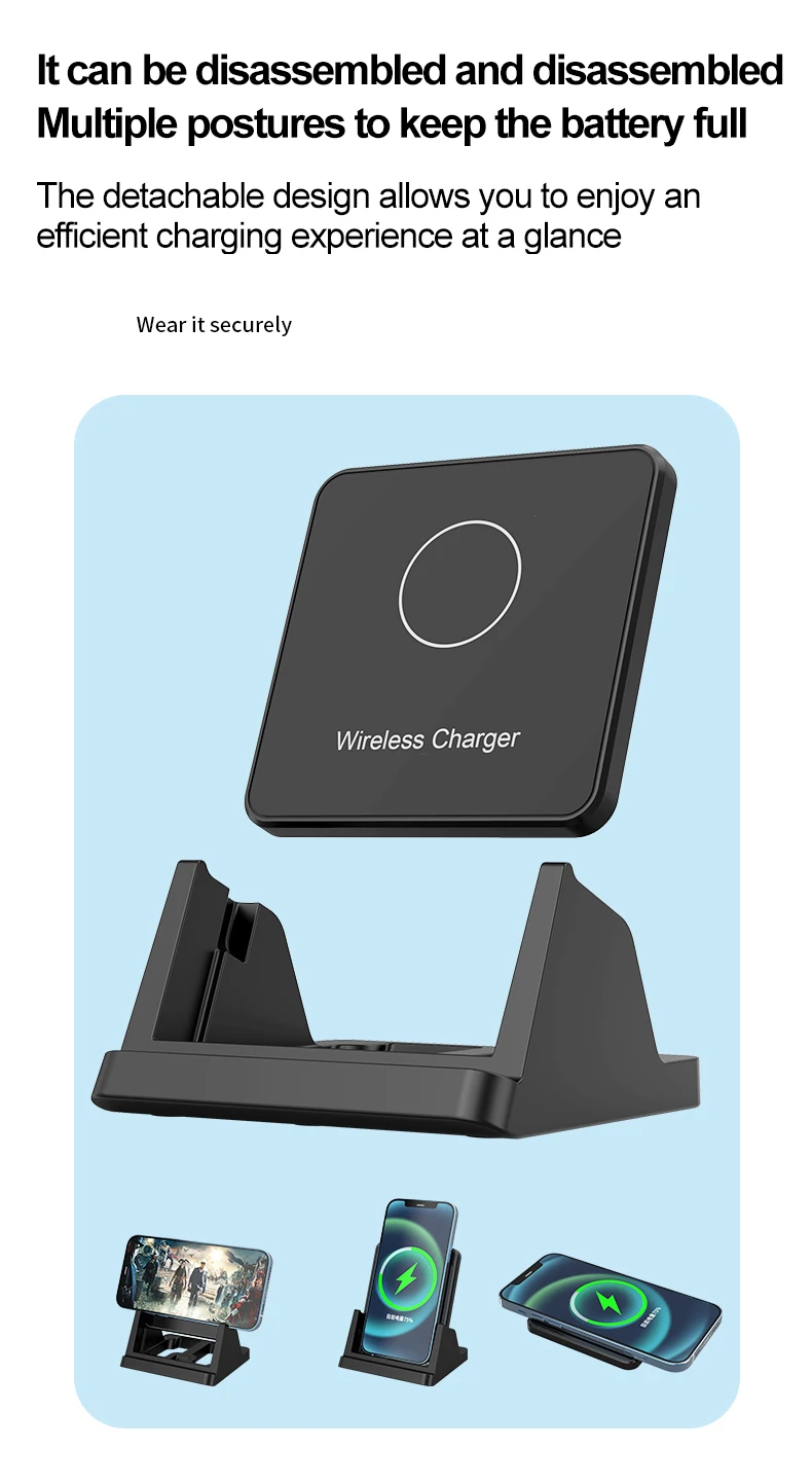 【Removable & VERTICAL & HORIZONTAL CHARGING】With an LED in the front that lights up when you're charging your phone, this wireless charger stand touts anti-slip bars and sleek design, In addition to the ability to charge your phone horizontally or vertically, whichever provides a perfect view angle for your eyes, no matter you watch movies, listen to music, make calls or send the message without interruption during the whole charging process.